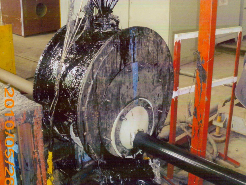 3、將預熱至70~90℃的鋼管通過已調整好的涂膠器刮膠環,使熔融后的膠均勻涂到鋼管外壁。